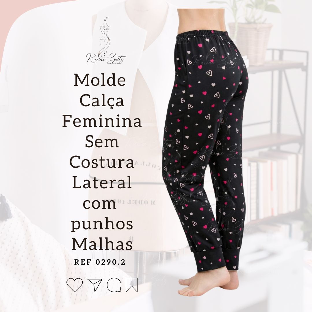 Molde Calça Malha feminina com punhos sem costura lateral para ser confeccionada com malhas em geral.